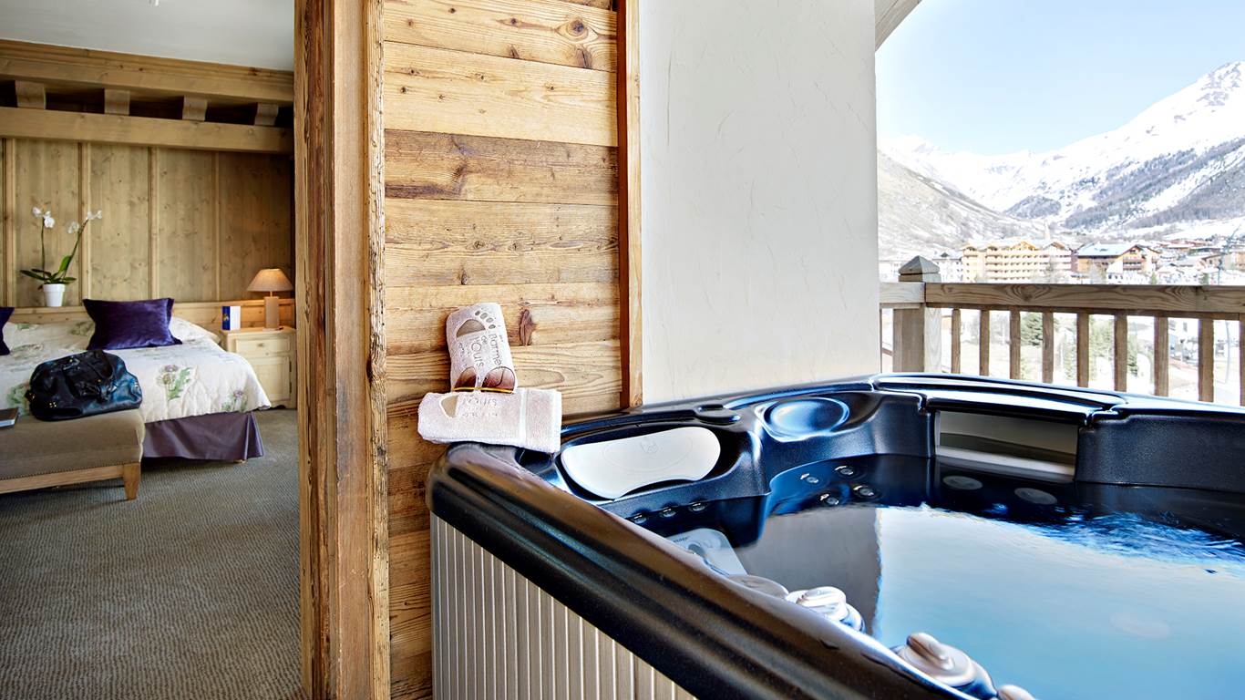 Suite de l`Ours (80 кв. м): балкон, прихожая, спальня с гостиной зоной, ванная комната с джакузи и душевой кабиной, сауна, хамам. Расположены на 4 этаже. Вид на зону катания.