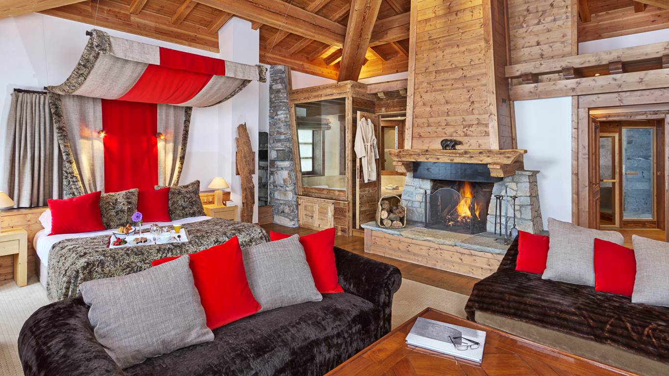 Prestige suite (60 кв. м): балкон, прихожая, гостиная или гостиная зона, спальня с кроватью king-size, ванная комната с джакузи и душевой кабиной. Расположены на верхнем этаже. Панорамный вид на Валь д’Изер и горы. Возможно объединение с номером категории Junior suite.